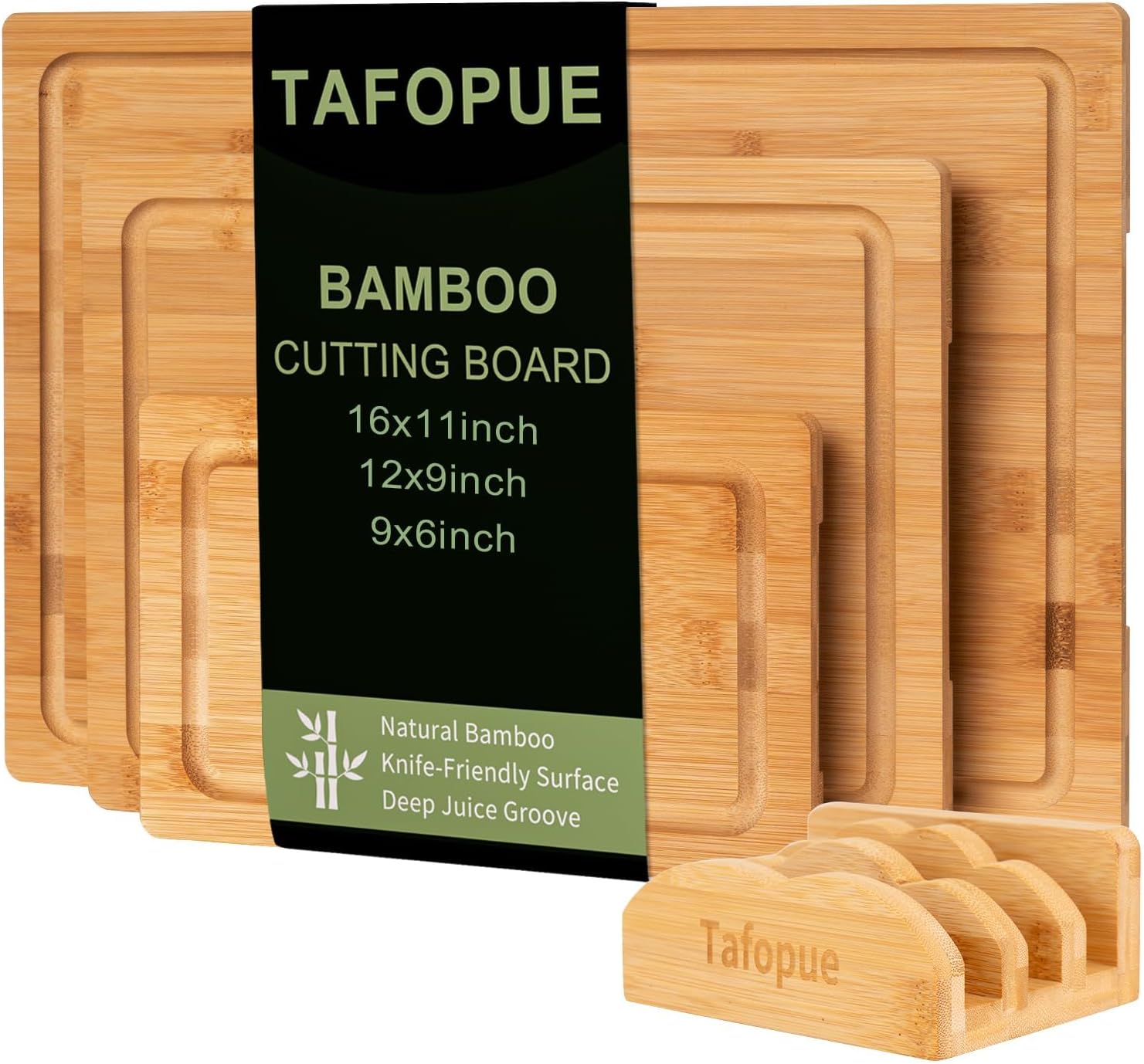 Cutting Board Set with Holder, Space Saving Kitchen Bamboo Chopping Boards, Build in Juice Groove and Grip Handle, Durable Wooden Serving Board for Meal Prep & Charcuterie, Gift Idea