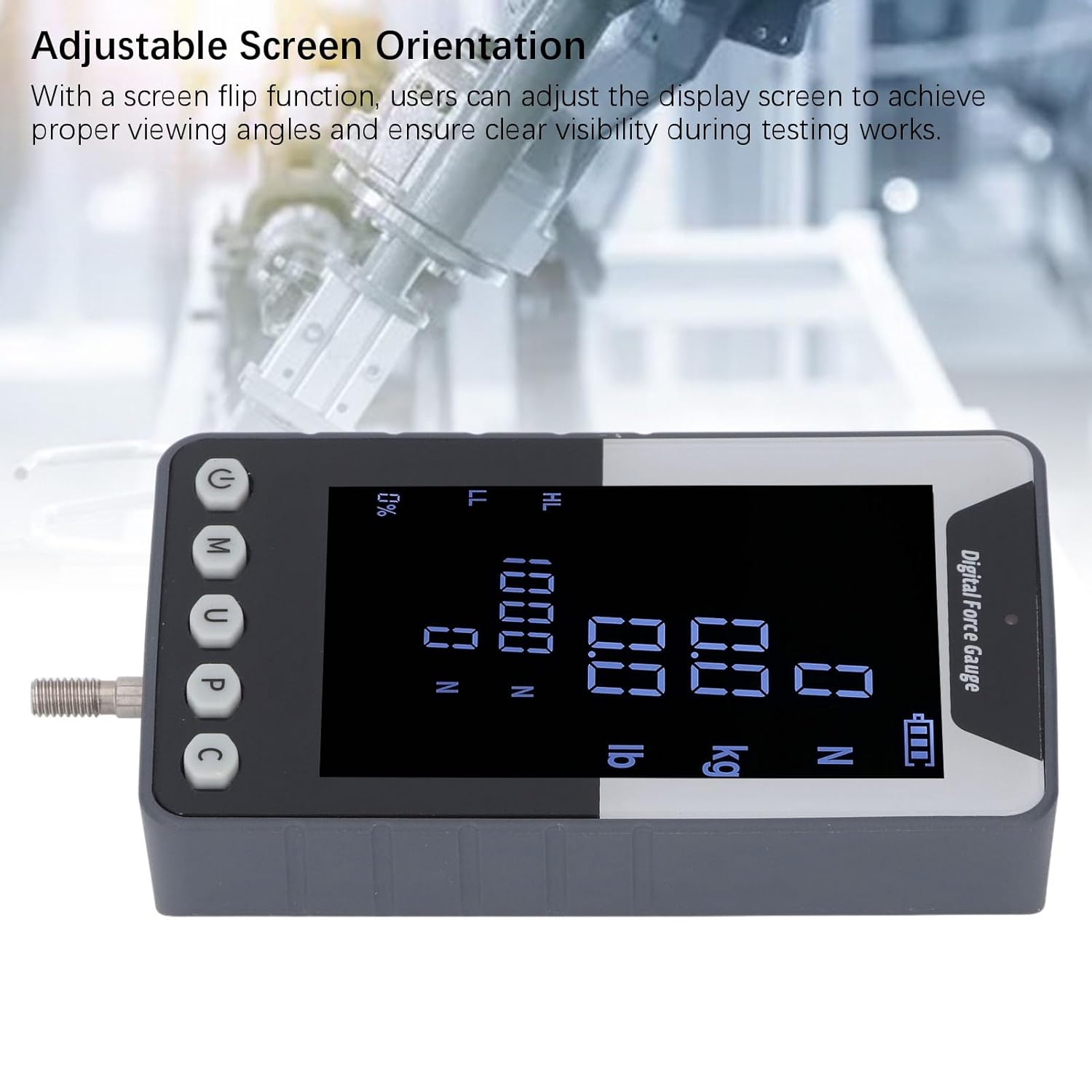 Spec: Item Type: Digital Force Gauge Maximum Load: 50N, 11lb, 5Kg Measurement Range: 5-50N.m Load Graduation: 0.001N, 0.0001kg, 0.0001lb Sensor Structure: Built in Accuracy: ±0.5% (10-100 % of full scale) Power Supply: 1 x 3.7V Lithium Cell 1800mah (Built in) Charging Time: 4-6 hours Continuous Battery Life: About 15 hours Power Output: DC5V 1A Working Temperature: 5℃-35℃ Transport Temperature: -10℃-60℃ Relative Humidity: 15%-80%RH Working Environment: No seismic source or erosion medium in the surroundings Package List: 1 x Charging Plug 1 x Force Gauge 1 x Charging Cable 5 x Washers 5 x Screws 1 x User Manual 1 x Nut 6 x Accessories 1 x Storage Box How To Use: Follow the instruction manual 1. Convenient Features: Includes a screen flip function for easy viewing from different angles, a 3.7v 1800mah battery for 15 hours of continuous use, and automatic shutdown after 10 minutes of inactivity. 2. Clear and Intuitive Display: This digital force gauge features a large color screen for easy reading and high accuracy, ideal for testing push pull and tensile forces. 3. Versatile Measurement Range: With a range of 5-50n.m, this gauge can display n, kg, and lb measurements simultaneously, catering to the needs of different users. 4. Multiple Measurement Modes: Easily switch between real-time mode, top mode, and first top hold mode to flexibly obtain force data as required. 5. Data Synchronization: Connects to a computer via a data cable for synchronization testing, allowing for data export and analysis via software, making it suitable for various scenarios.