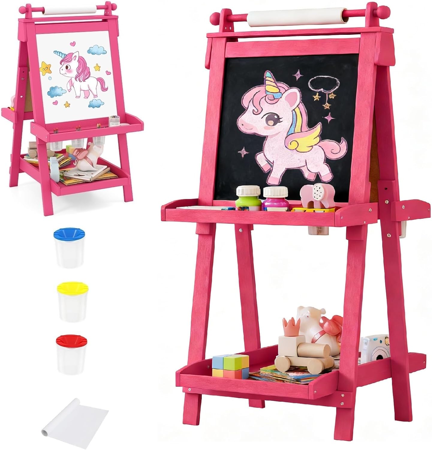 Description:Why You Choose Olakids Kids Art Easel?This 3 in 1 kids art easel is a fantastic creation designed with multiple features to inspire young artists.Crafted from high-grade pine wood with a kids-friendly coating, this drawing art board is robust and safe, featuring rounded corners to ensure accident-free play. Additionally, this foldable art easel is designed for easy storage and carrying. This painting board also offers 3 height adjustments (41.5/45.5/49.5 inch) to grow with the child, providing a comfortable drawing experience for kids over 3 years old. Plus, with a magnetic whiteboard, chalkboard, and paper roll, this versatile easel supports various creative activities. Moreover, this art easel for boys and girls meets US CPSIA & ASTM safety standards. You can have confidence that your children will play, learn, and grow in a more secure manner.Features:ASTM and CPSIA certifiedMultifunctional art easel for drawing, writing and organizingA magnetic whiteboard, a chalkboard and a paper roll included2 side trays and bottom shelf for organizing kids suppliesMade of selected pine wood with kids-friendly coatingSolid triangular structure ensures reliable steadinessSafe to use with the smooth surface and round corners3 height adjustable accompany little artists’ growthFolding design for easy storage and convenienceSuitable for kindergarten, nursery, playroomRoll paper provides extra drawing spaceAccessories included a paper roll and 3 cupsFabulous gift for kids over 3 years oldAssembly is requiredSpecifications:Material: Pine WoodDimensions of Art Easel: 25.5 x 17 x 41.5/45.5/49.5 inch (L x W x H)Dimensions of Whiteboard: 18 x 16.5 inch (L x W)Dimensions of Chalkboard: 18 x 16.5 inch(L x W)Dimensions of Large Bottom Shelf: 25.5 x 16 inch (L x W)Width of Paper Scroll: 11.8inchNet Weight: 20 lbsRecommended Age: 3+ Years OldPackage Includes:1 x Art Easel1 x Paper Roll3 x Cups