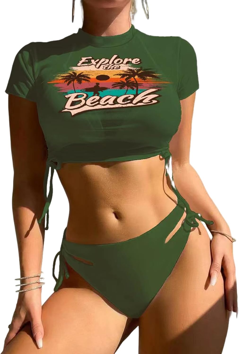Material: Made of 82% Nylon and 18% Spandex, this sheer rash guard swimsuit sets are high quality, super stretchy and skin friendly, super comfortable for women to go surfing, swimmming, kayaking.